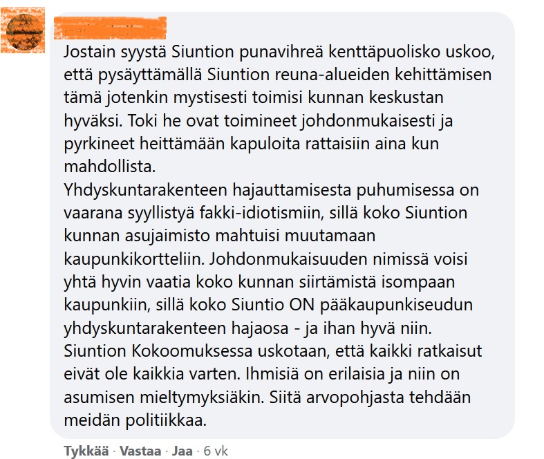 Kommentti on erityisen törkeä, kun ottaa huomioon, että sillä leimattiin tavallinen siuntiolainen ”fakki-idiootiksi”. Tälle valtuutetulle oli ilmeisesti liikaa, että kuntalainen sattui ymmärtämään tehtyjen kaavoituspäätösten johtavan yhdyskuntarakenteen hajautumiseen vastoin kaikkia maankäytön ja kaavoituksen perusperiaatteita.