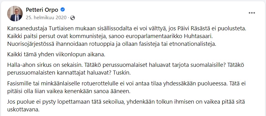 Tosiasia on, että pääministeri Orpo ei tule koskaan pääsemään kyseenalaisesta leimasta, jonka Perussuomalaiset, nyt Orpon mielestä ennakoimatta, ovat häneen lyöneet. Siitä hän voi kiittää vain ja ainoastaan itseään ja omaa arvoja koskevaa takinkääntöään, eli äärioikeiston hallituskelpoisuuden takuumieheksi ryhtymistä.